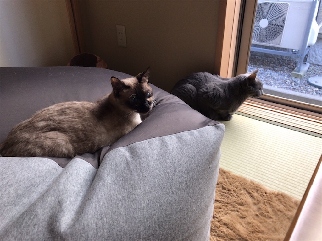 新調したビーズクッションを誰のものかで争うちぃ様とらいむ様…(ご主人たちのことはムシ…😅)